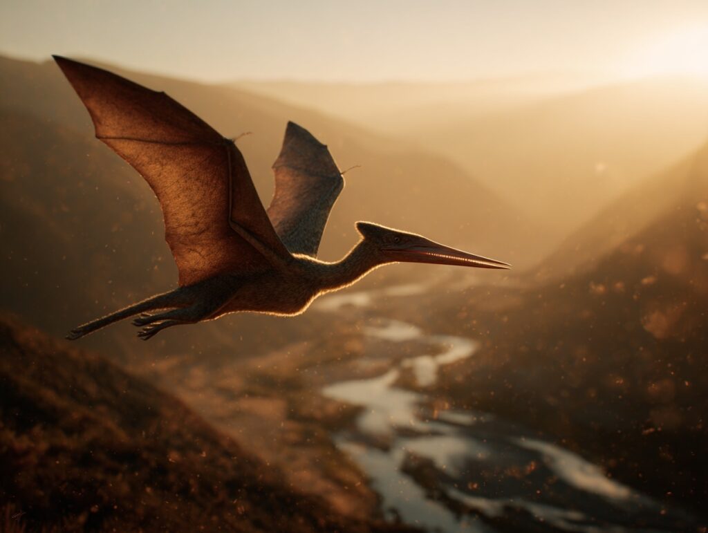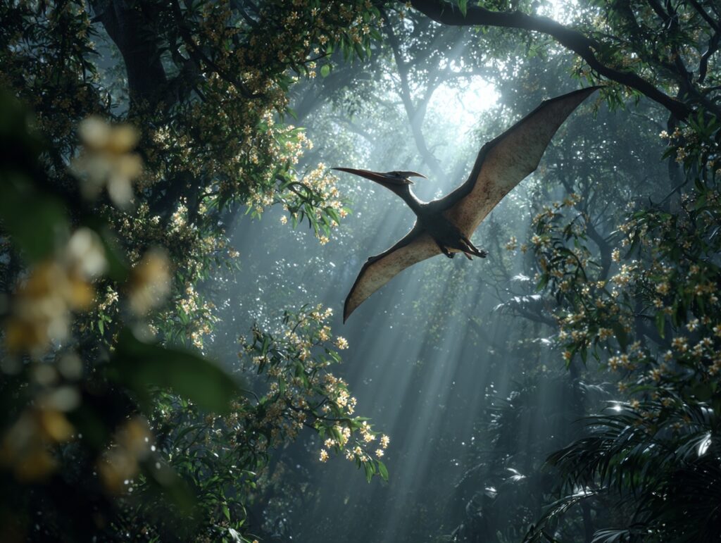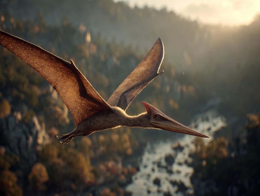 I looked up and saw it: a Pterosaur with a wingspan at least 20 feet wide, gliding silently above the treetops. Its beak was long and narrow, perfect for catching fish. My heart stopped when it tilted its head and spotted me.